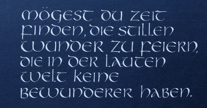 Seit über 20 Jahren beschäftige ich mich mit Kalligrafie und bin bis heute fasziniert von diesem feinen Handwerk. Es war wohl mein erlernter Beruf als Bauzeichner, der mich zu dieser Kunst führte. Bei einigen LehrerInnen durfte ich vieles rund um die Schrift erlernen, mitnehmen und erfahren wie das Schreiben auf eine gute Weise weitergegeben werden kann.